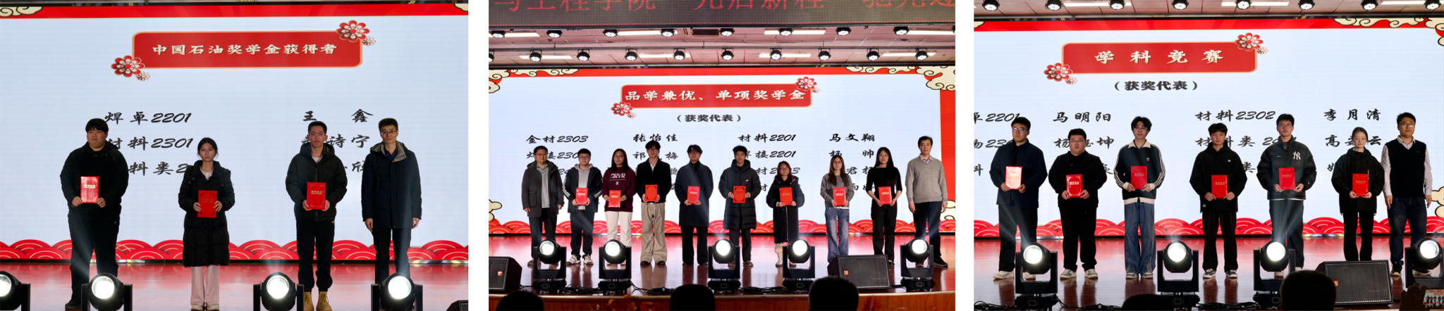 领导老师为国家奖学金、国家励志奖学金、中国石油奖学金、品学兼优奖学金、单项奖学金及省部级以上学科竞赛获奖者代表颁发了荣誉证书。